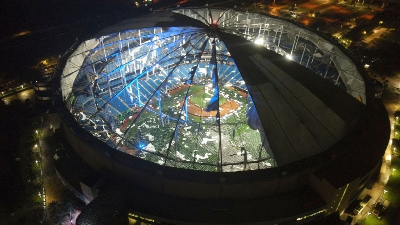 L’équipe a précédemment déclaré que Tropicana Field possède le plus grand toit en dôme soutenu par des câbles au monde, avec des panneaux constitués de "fibre de verre translucide recouverte de téflon" soutenu par 180 miles de câbles reliés par des entretoises.