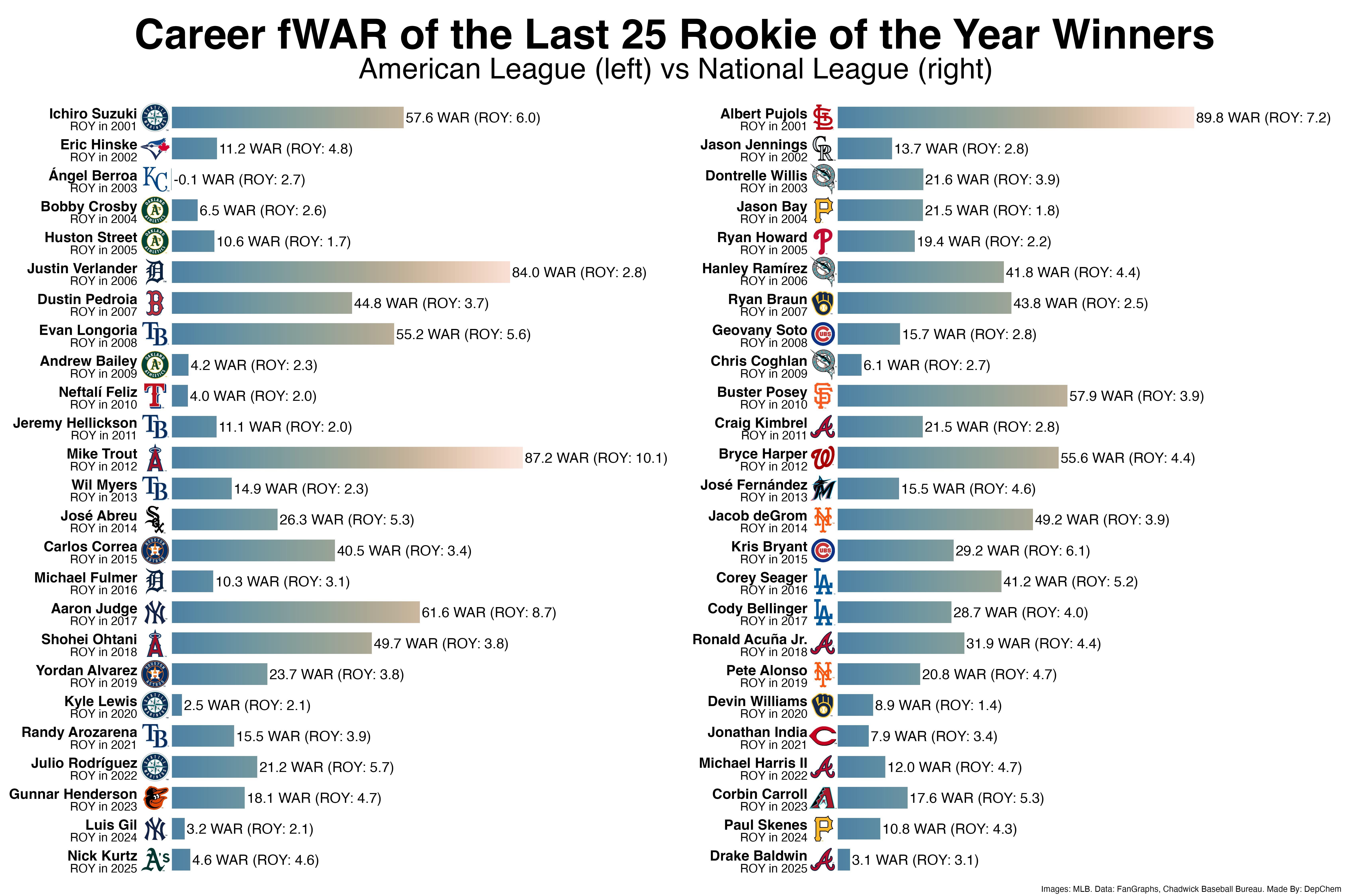 Les gagnants AL à gauche et les gagnants NL sont à droite. Chaque barre indique le fWAR total en carrière d’un joueur, avec son fWAR de saison de recrue de l’année entre parenthèses. Alors que les saisons d’élite de ROY donnent lieu à un battage médiatique pour le succès futur, le graphique met en évidence l’ampleur de l’éventail des résultats de carrière. Alors que certains joueurs sont devenus des stars générationnelles définissant la franchise, d’autres ont maintenu une production solide mais pas d’élite, ont chuté en raison d’une blessure ou ont simplement atteint leur apogée au cours de leur année ROY.