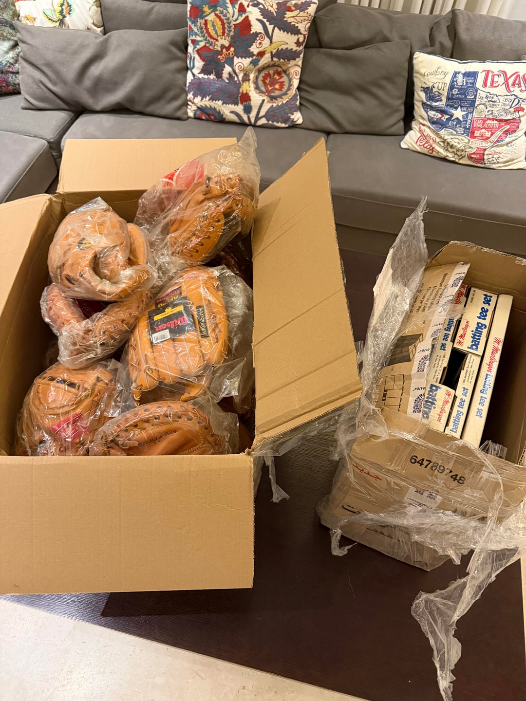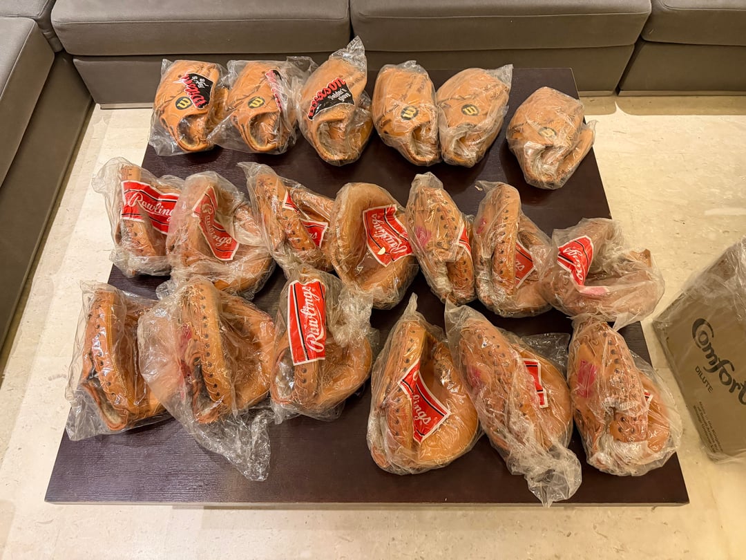 J’ai acheté tout ce qu’il avait et je me suis retrouvé avec 13 gants de receveur Rawlings RCM50 et 7 gants Wilson A2000 XL. Ce sont tous TOUT NEUF en parfait état. Ils sont restés dans des sacs quelque part en Arabie Saoudite depuis probablement 40 ans. Je suis choqué par l’état dans lequel ils se trouvent : ils ne sont pas desséchés ou quoi que ce soit.