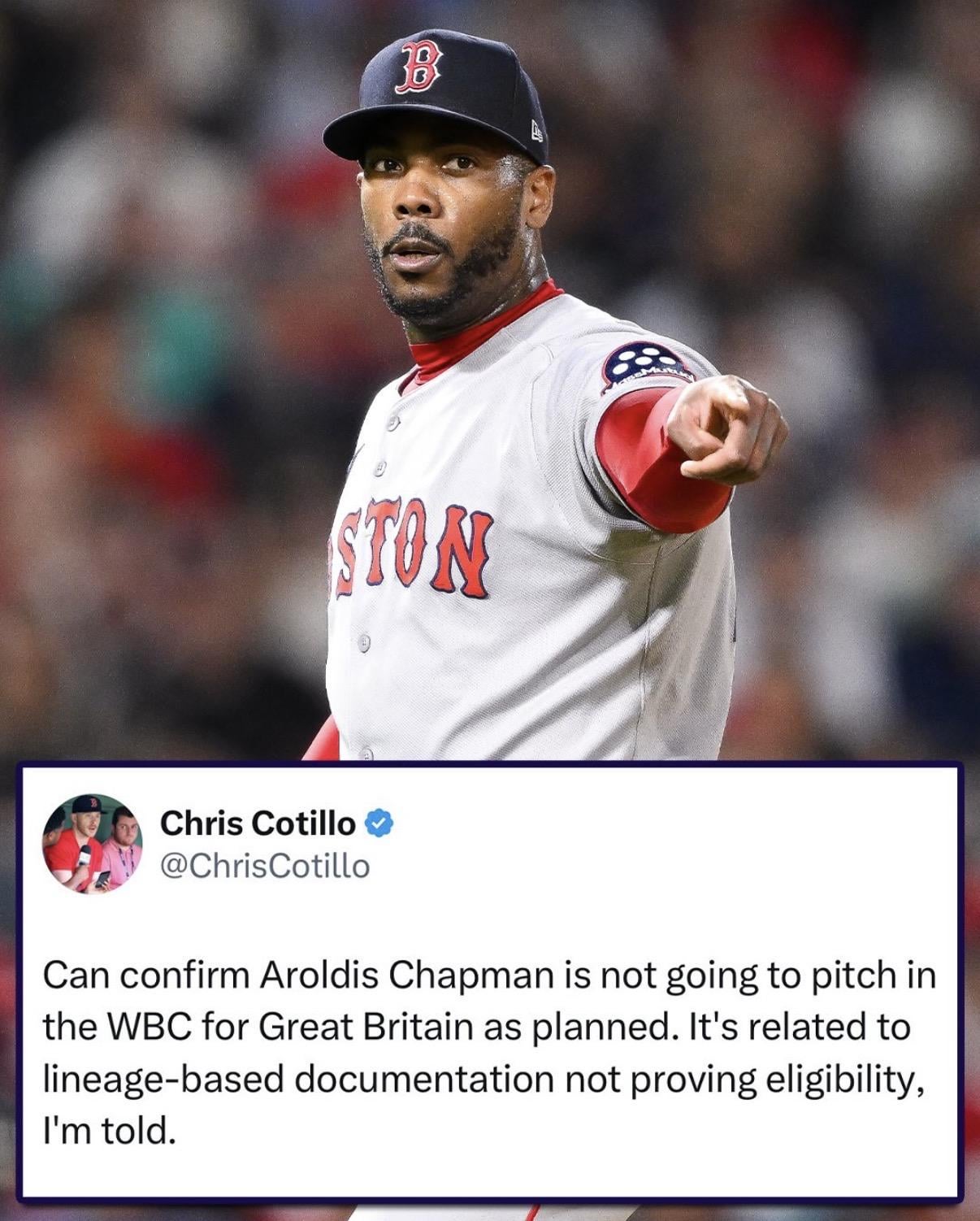 Aroldis Chapman ne représentera pas la Grande-Bretagne dans la WBC en raison de documents basés sur la lignée ne prouvant pas son éligibilité.