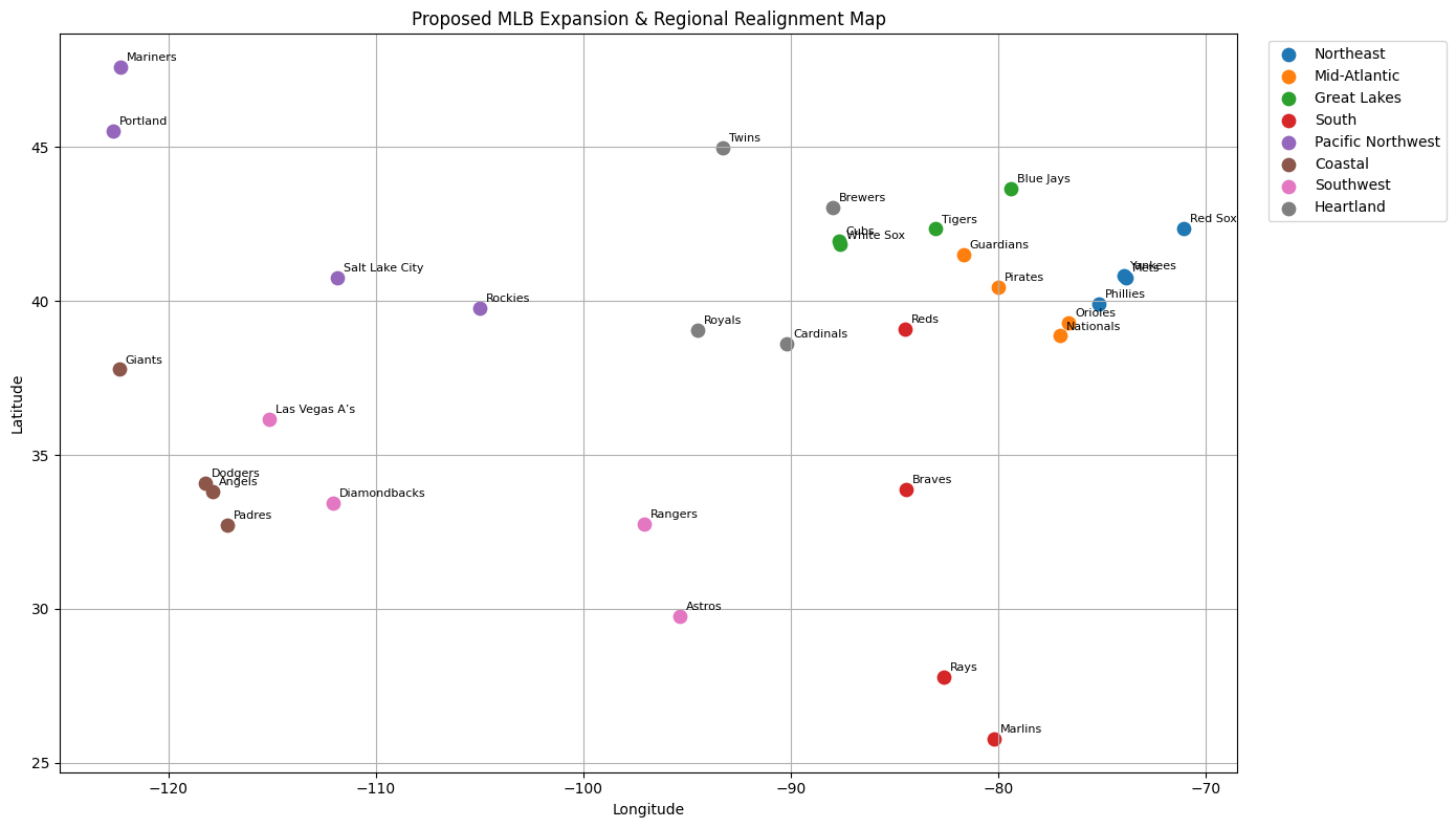 J’ai ajouté des équipes d’expansion à Portland et à Salt Lake City, les seules villes d’expansion potentielles avec des plans de stade. Ils ont également des rivaux instantanés dans les villes rivales connues des États voisins. En plus d’aider à briser l’isolement des deux équipes les plus isolées du baseball.