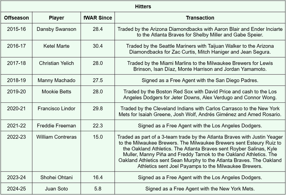- La formulation est "changé d’organisations MLB" parce que j’ai inclus les joueurs qui étaient des prospects à l’époque (Swanson) et exclu les joueurs qui ont rejoint une ligue non MLB (la signature d’Ohtani avec les Angels).