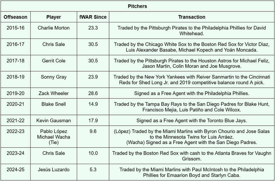 EDIT : Le leader des lanceurs pour l’intersaison 2024-25 devrait en fait être Garrett Crochet avec 5,8 fWAR, au lieu de Luzardo. Je pense que la raison pour laquelle il est passé est parce qu’il y a eu tellement de transactions le 11/12/24 que le journal des transactions MLB a 2 pages pour ce jour, ce qui est rare, et mon code n’a pas vérifié la deuxième page. Merci aux commentateurs qui l’ont signalé !