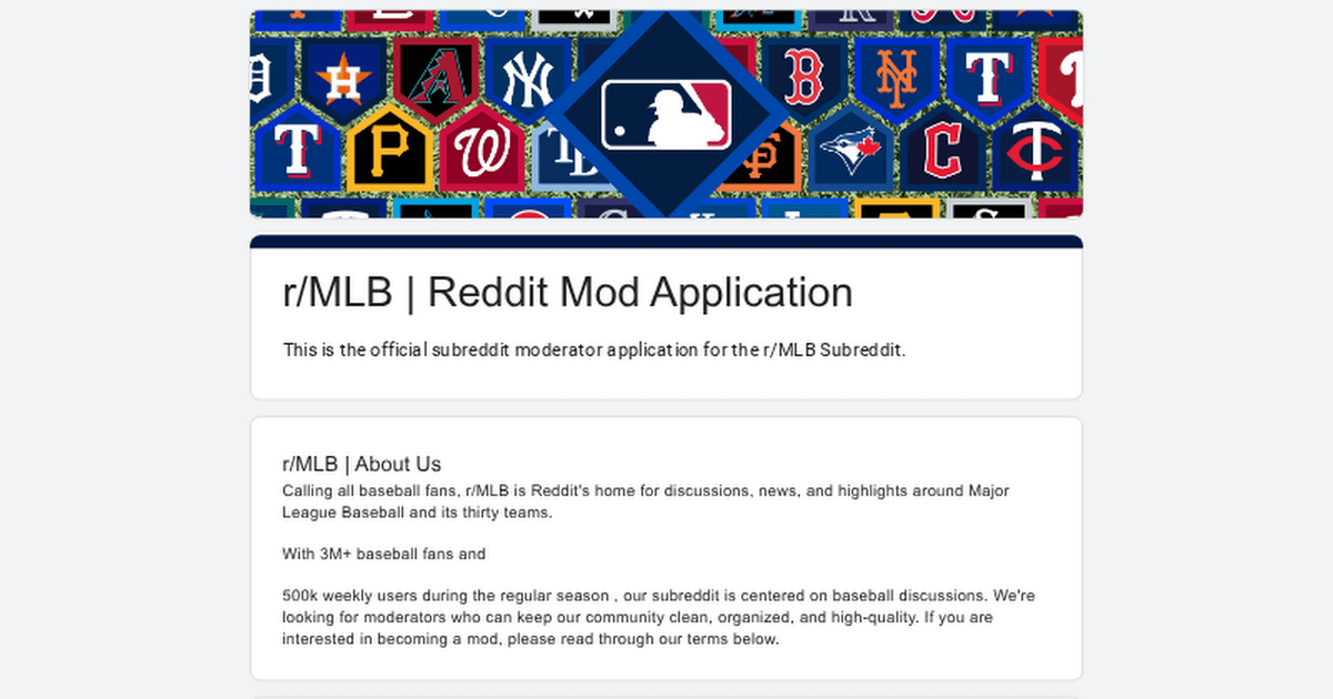 Avec plus de 3 millions de fans de baseball et 500 000 utilisateurs hebdomadaires pendant la saison régulière, notre subreddit est centré sur les discussions sur le baseball. Nous recherchons des modérateurs capables de garder notre communauté propre, organisée et de haute qualité. Si vous souhaitez devenir mod, veuillez lire nos conditions ci-dessous.