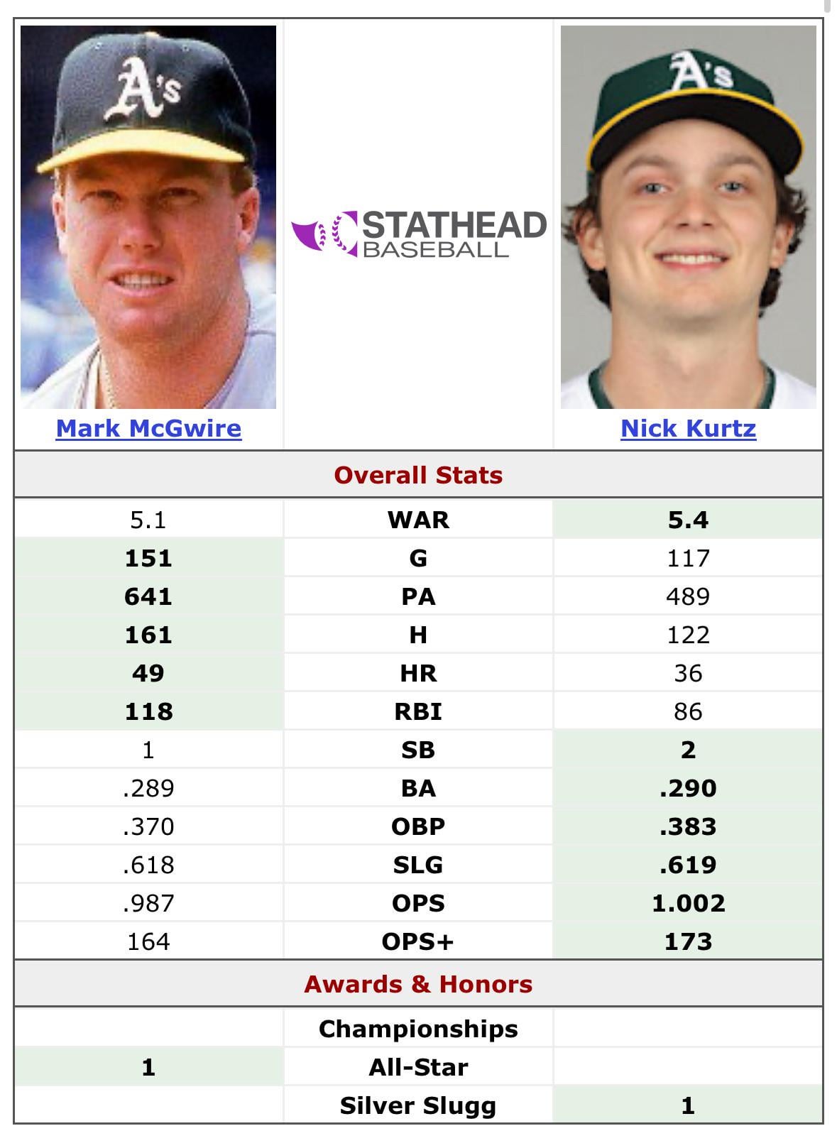 Kurtz bat McGwire dans presque toutes les catégories de taux et le devance même dans WAR malgré moins de matchs. Ce n’est pas quelque chose que vous dites à la légère lorsque la comparaison concerne l’un des plus grands frappeurs puissants de l’histoire de la franchise.