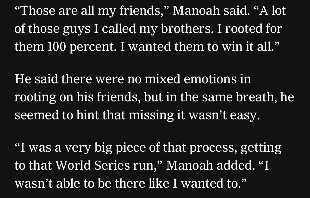 « Getting to that World Series run » is doing a ton of heavy lifting there, but I suppose you can argue he has a point. It’s less damning than the other quote out of context made it sound: he obviously wasn’t important to them in 2025, but he was important to them in…2023 or whatever that year was when he was good. And he was a piece of them becoming playoff contenders finally, even if they never won any playoff games until last year when they almost won all of them.