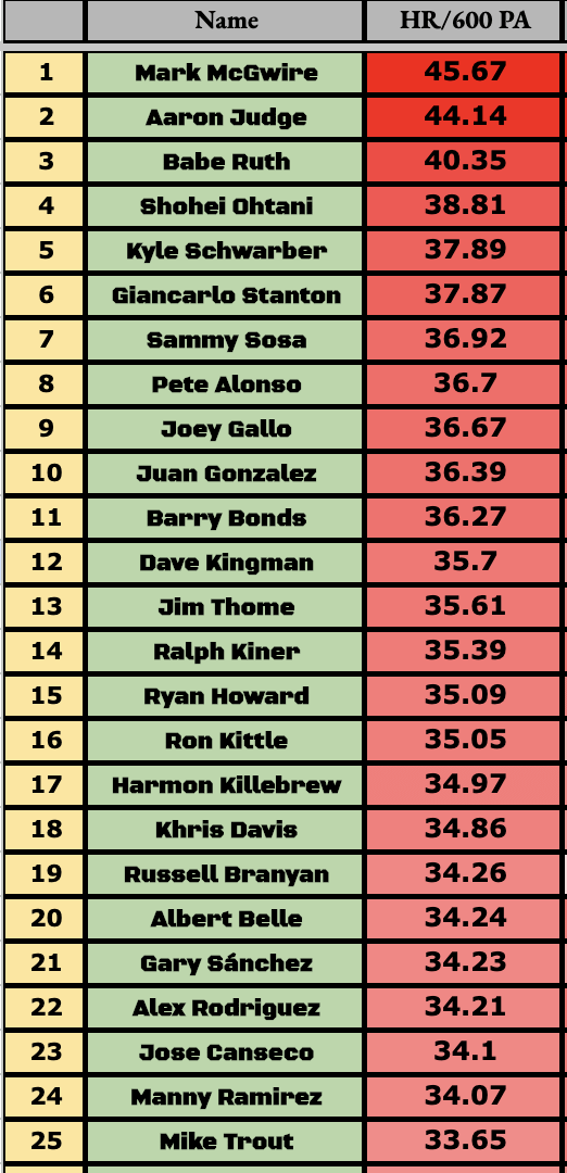 Fun analysis. I was curious about my guy Cal Raleigh, he’s just shy of the minimum at 2465 PA. If I’ve done my math right, it works out to 37.24, which puts him just behind Stanton. If I add 45 PAs with no home runs to get to 2500, it’s 36.72, still in the top 10. Not too shabby.
