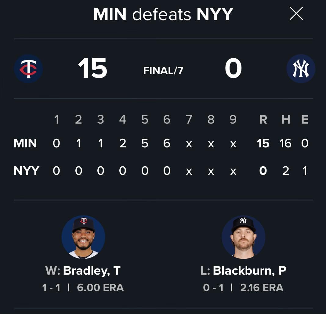 Les Twins battent les Yankees 15-0 en 7 manches— Par Knightbear49 Baseball 14 Comments Knightbear49 3 heures ago Twins hit in the Top of the 7, the bottom of the 7th was not played Darkforces134 3 heures ago So that’s what that’s like YodaForceGhost 3 heures ago Don’t let this distract you from the fact that Trent Grisham only has one hit this Spring Training Correct_Sometimes 3 heures ago mercy ruled. get fucked CabassoG 3 heures ago Rain: I’ll mercy rule the Yankees myself. xho- 3 heures ago  ProtestantMormon 3 heures ago Padres are coming for that in the 2nd inning Blevanhoval 3 heures ago holy shit get merc’d yanks (let me have this plz) jcnardonejr 3 heures ago F.I’m friends with Paul.It’s a dream for a kid to play in pinstripes. Need to turn the F into a W. Lol ANGRY_BEARDED_MAN 3 heures ago Me: Numbers and stats and shit don’t matter in spring training, guys are just getting work in blah blah blahAlso me: LMFAOOOO GET REKT YANKEES Atomic_Horseshoe 3 heures ago Close to what we call a “Fibonacci” in the biz. gorillaphi 3 heures ago Plan the parade? TexasHot 3 heures ago Seattle might be next.Padres just put up 13 in the second kingcong95 3 heures ago Write A CommentVous devez vous connecter pour publier un commentaire.