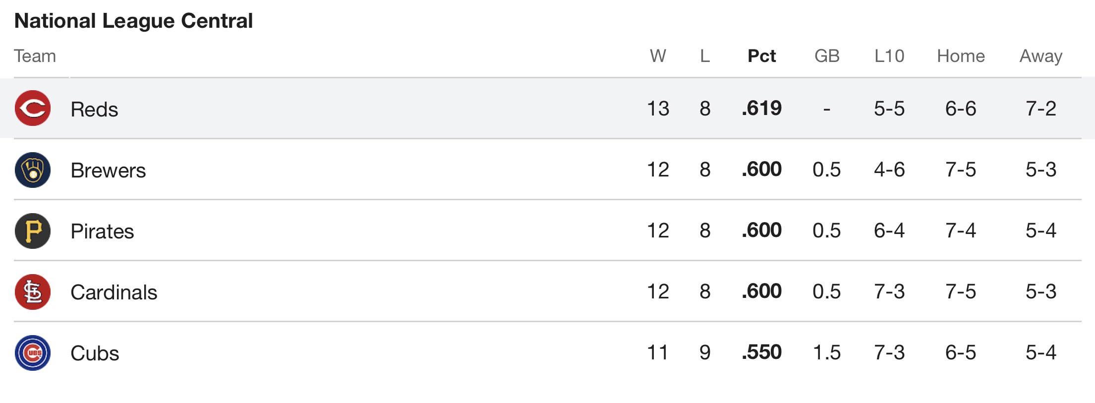 Avec une égalité à 3 pour la 2e place dans la NL Central et toutes les équipes au-dessus de .500, cette division est extrêmement compétitive. Les Cubs occupent la dernière place et à seulement 1,5 matchs derrière. En tant que fan né et élevé de Cincinnati, c’est la division la plus excitante depuis longtemps.