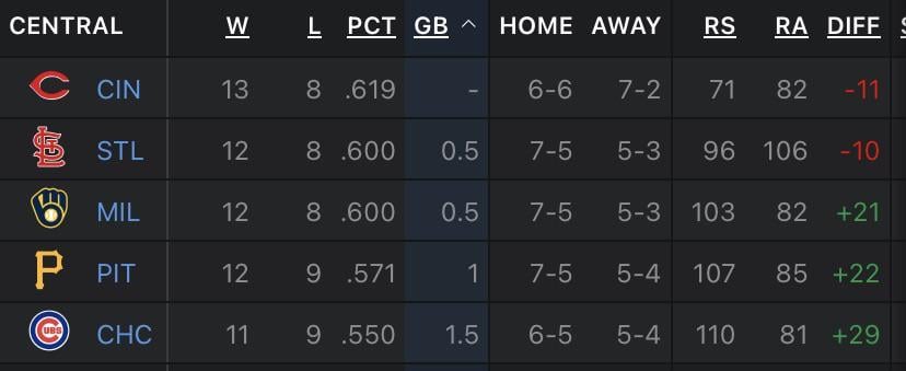 Le classement actuel de la NL Central est en quelque sorte l’ordre inverse du différentiel de points.