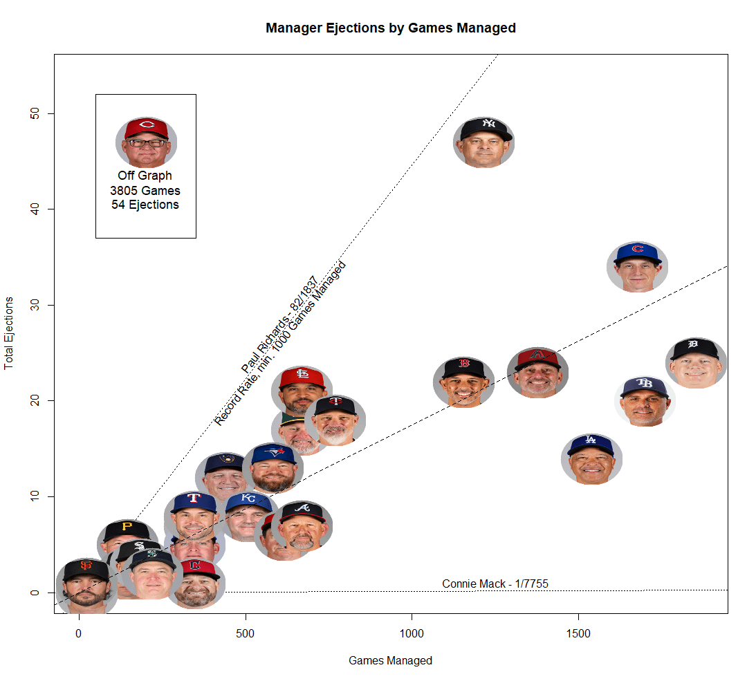 We’ll see if anyone can approach the Paul Richards line who managed from 1951-1961 for the White Sox and Orioles (and came back for the 1976 season for the White Sox much more mellow with 0 ejections, sadly bringing his career rate down).