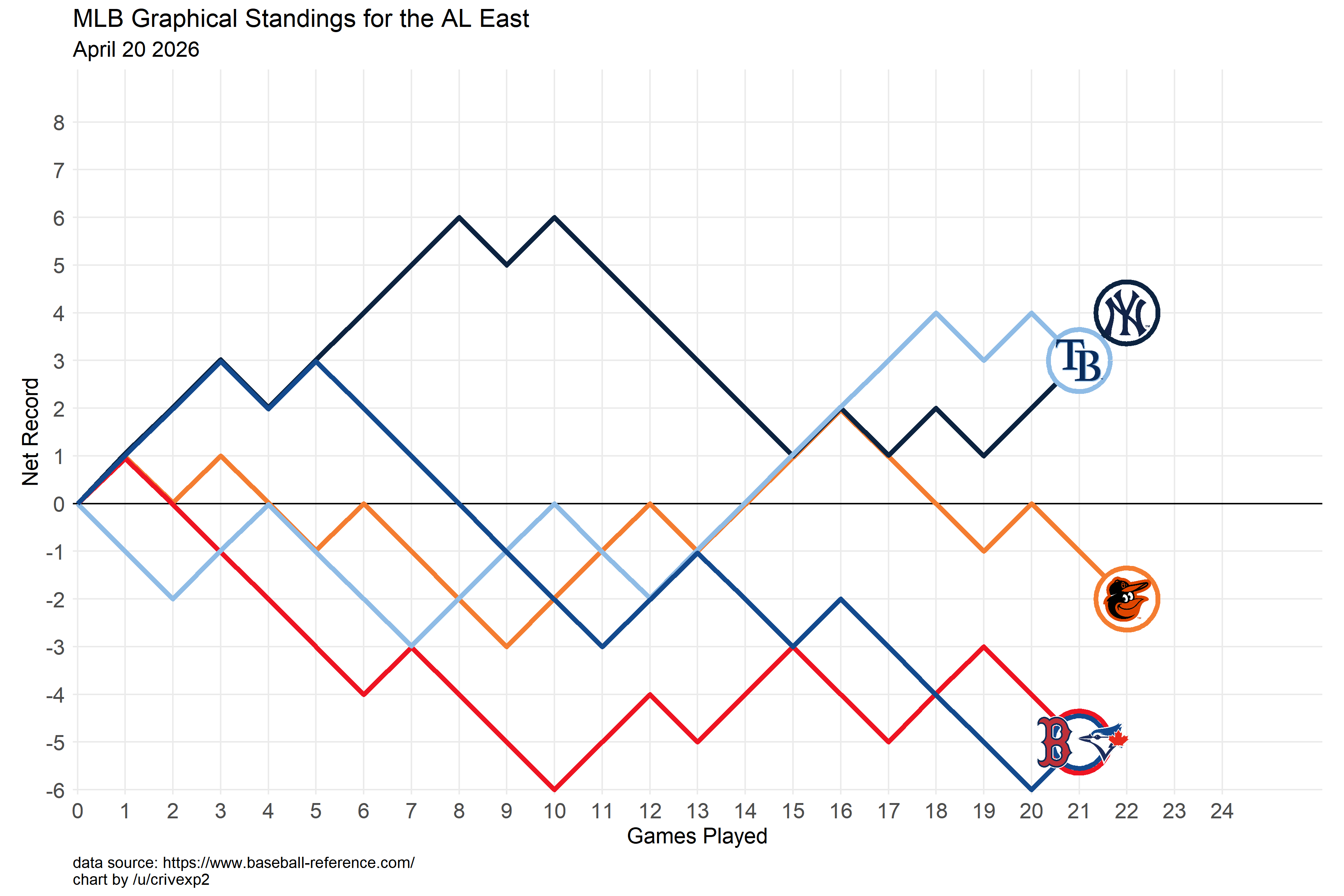 Classement graphique MLB – 20 avril 2026 — Par crivexp2 Baseball 14 Comments Recognition_Tricky 6 jours ago  polandspreeng 6 jours ago Mets and Royals having a rough week appleavocado 6 jours ago NL West startin’ to look like the ROCKIES! Also, NL Central all soaring looks like Power Rangers. YankeesGlazer69 6 jours ago Stay below us, Rays eekbarbaderkle 6 jours ago As we all predicted, the NL Central is the best division in baseball. greycubed 6 jours ago Braves looking scary. Apprehensive-Cost276 6 jours ago Man, I hate being in the NL West rismilbc 6 jours ago NLC teams taking to the sky to form voltron kj114 6 jours ago It’s beautiful HealthyBee4209 6 jours ago Love that final chart. firerosearien 6 jours ago Been waiting all winter for these posts to come back, thank yoooouuu JustHereForCatss 6 jours ago  mcauthon2 6 jours ago you can really see when the injuries started preptime 6 jours ago It is very funny to me that the AL West is like the complete inverse of the NFC West. Write A CommentVous devez vous connecter pour publier un commentaire.