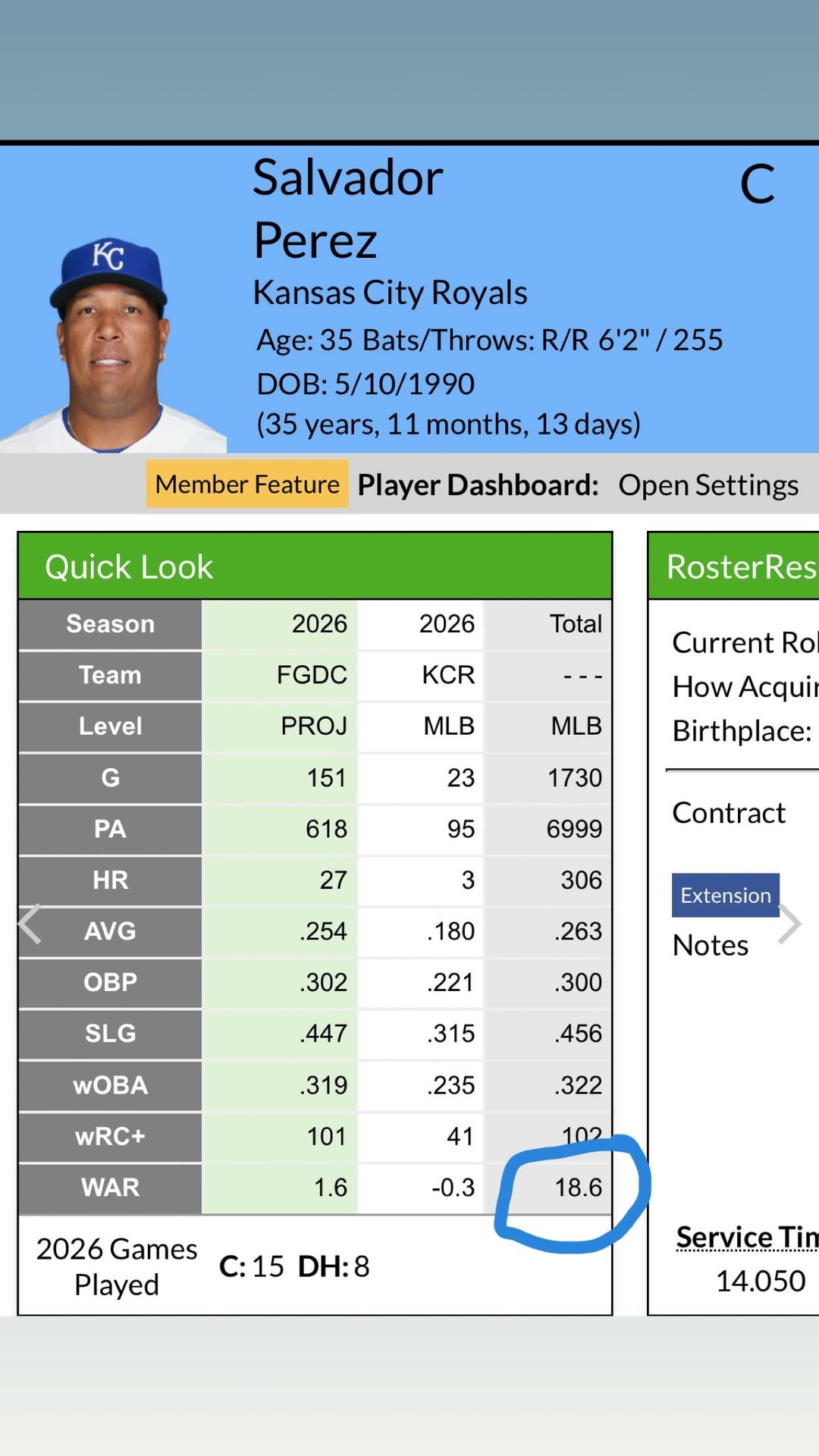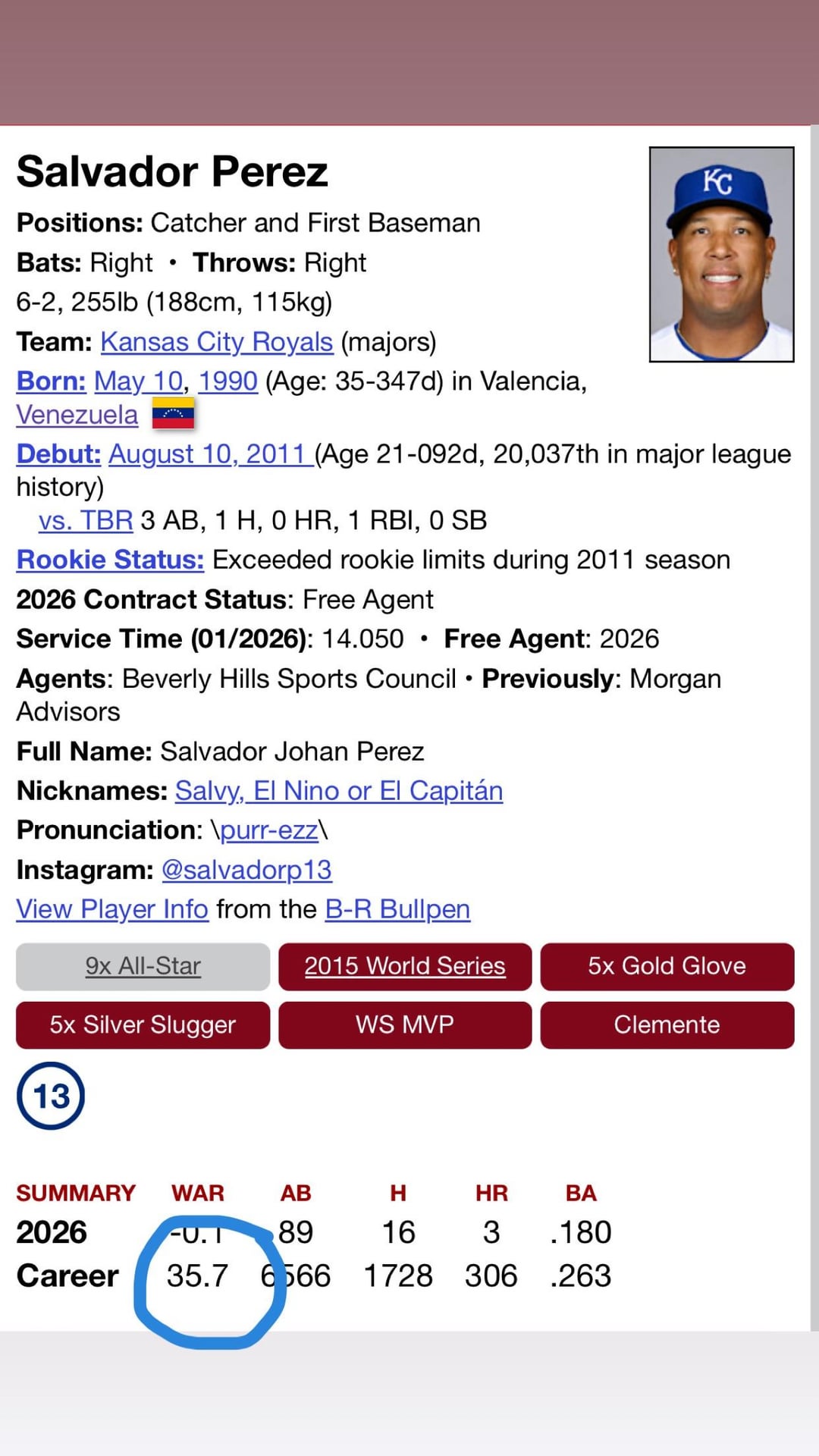 Mais wow, sa WAR, même sa bWAR, met les choses en perspective. Je dois être le pire joueur avec 9 apparitions all star, et j’irais même jusqu’à dire le pire avec 6-7 AS. Aussi, l’un des pires défenseurs par les statistiques avec 5 GG. Probablement l’un des pires défenseurs à avoir remporté plusieurs victoires. Mais était-il vraiment que mauvais derrière le marbre pour ceux qui ont beaucoup regardé le baseball de KC.