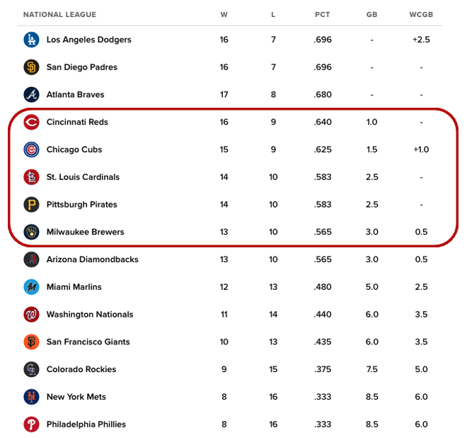 Actuellement, les 4e, 5e, 6e, 7e et 8e meilleurs records de la NL ne sont que les équipes centrales de la NL dans l’ordre.