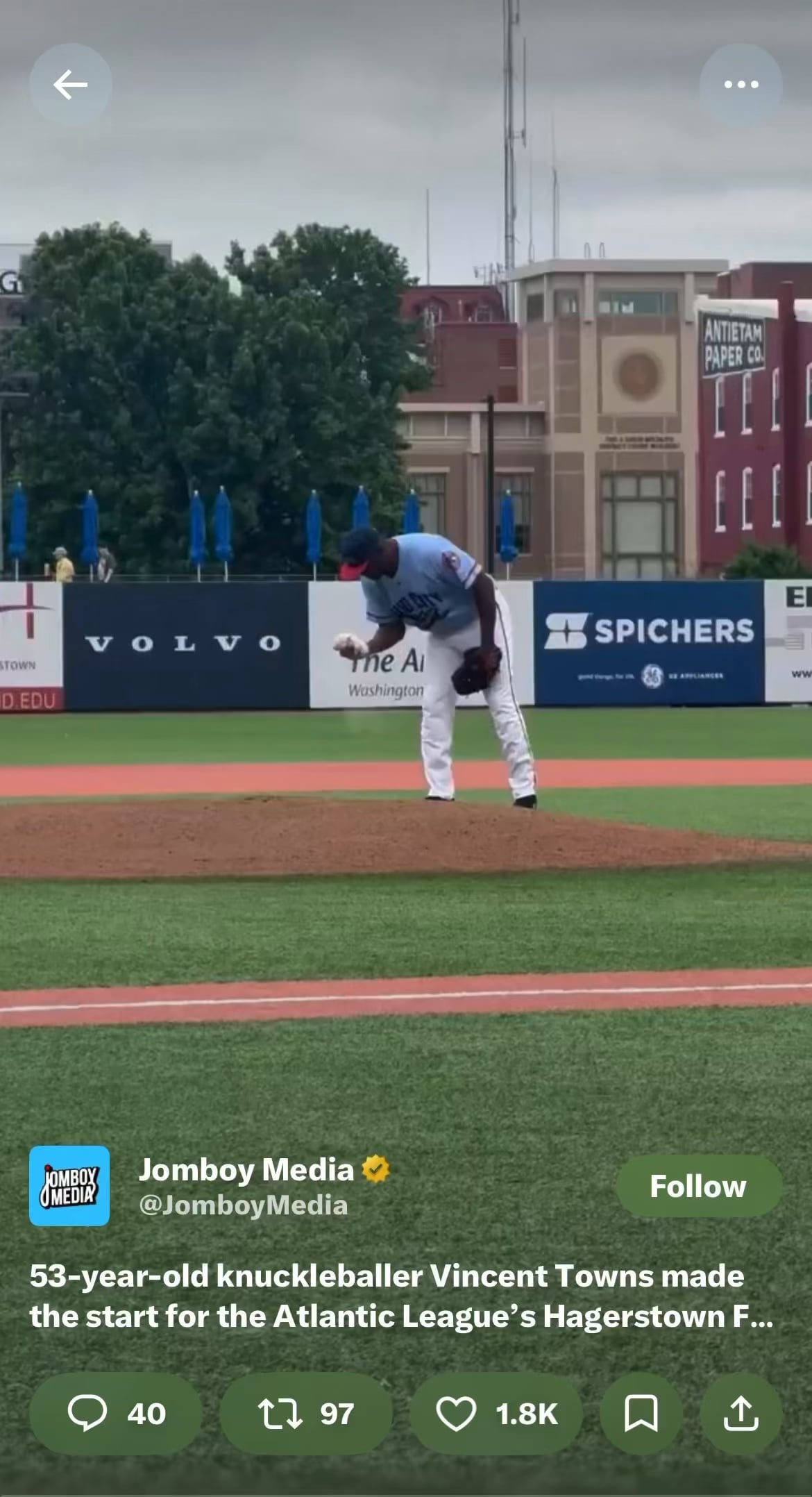 (Jomboy) Le knuckleballer de 53 ans Vincent Towns a pris le départ aujourd’hui pour les Hagerstown Flying Boxcars de la Ligue Atlantique 👏 Towns a travaillé dans la construction pendant 30 ans et a joué pour la dernière fois au baseball professionnel pour une équipe complexe de recrues mineures des Giants de San Francisco en 1992.