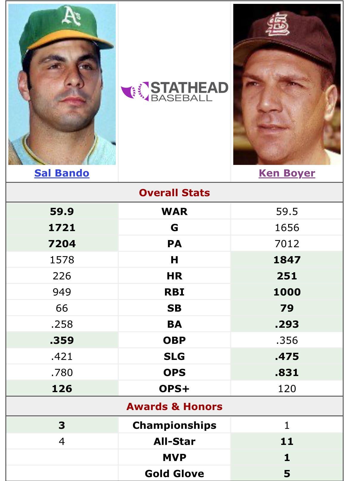 Les statistiques penchent en faveur de Boyer, mais Bando a joué à l’époque des lanceurs et a ancré la dynastie Oakland A’ à la troisième place. Il a eu du mal en WS mais très bon en ALCS.